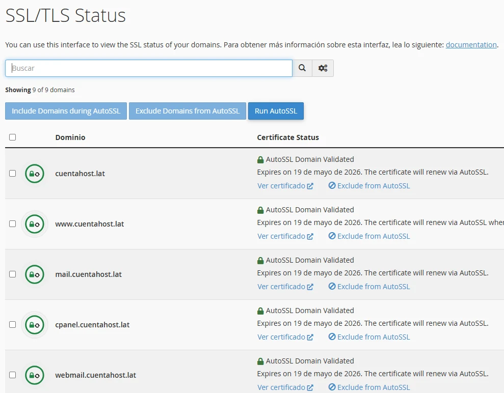 - Si algún dominio aparece marcado en rojo o con un color diferente al verde, selecciónalo y haz clic en el botón Run AutoSSL. Esto generará automáticamente el certificado para ese dominio.